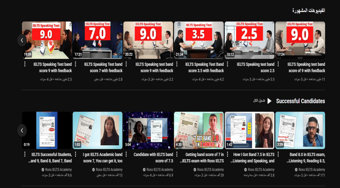 - ثم يوصي المعلمون بقناة Ross IELTS Academy لطلابهم الذين يرغبون في تحسين مهاراتهم في اللغة الإنجليزية وتحقيق النجاح في اختبار آيلتس.