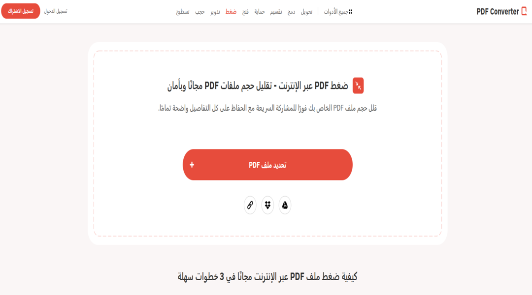 يوفر موقع PDF Converter إمكانية ضغط الملفات الموجودة على جهازك أو على جوجل درايف، كما يمكنك إضافة رابط الموقع الذي يحتوى على الملف.