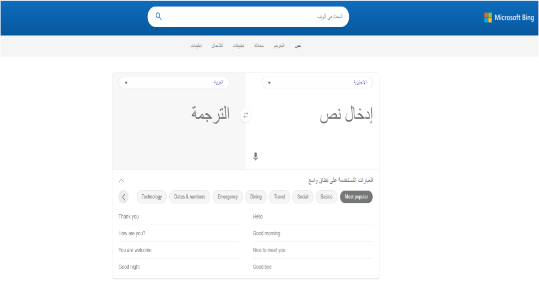 يمكنك استخدام Bing Translator لترجمة أي نص، بما في ذلك النصوص الطويلة والقصيرة. يمكنك ترجمة النصوص بين أكثر من 100 لغة. ترجمة الصفحات الإلكترونية.
